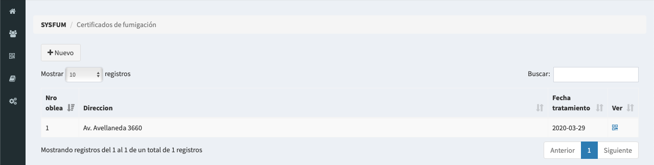 Dentro del módulo de certificados, encontrara un listado ordenado con el Número de oblea, dirección y vencimiento.