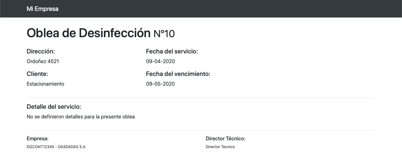 Al escanear el código QR, se visualiza un resumen de la oblea donde aparecen los datos de la empresa que lo emitió, junto con su Numero,fecha de emisión, vencimiento y detalle. Cargados a la hora de generarla.